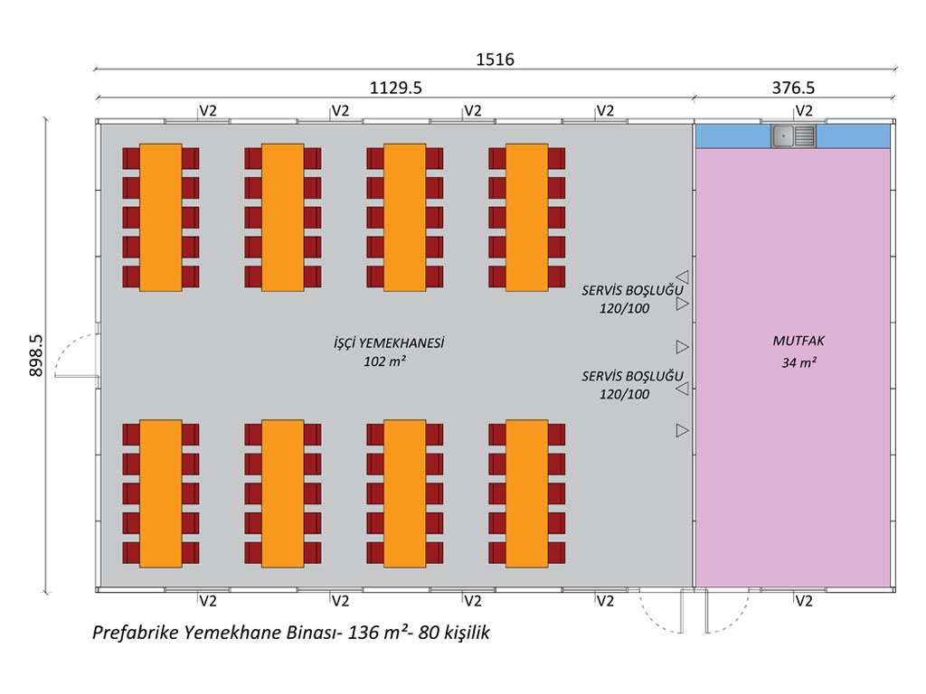 This prefabricated dining hall building is designed to meet the need for a large dining area with an area of 136 m² and a capacity of 80 people. The 102 m² section of the dining hall offers a comfortable dining experience with a regular seating area. The table arrangement, each of which provides easy access, allows workers to be in a spacious environment during meal times. In addition, there are two service spaces, 120/100 cm wide, for easy meal service.